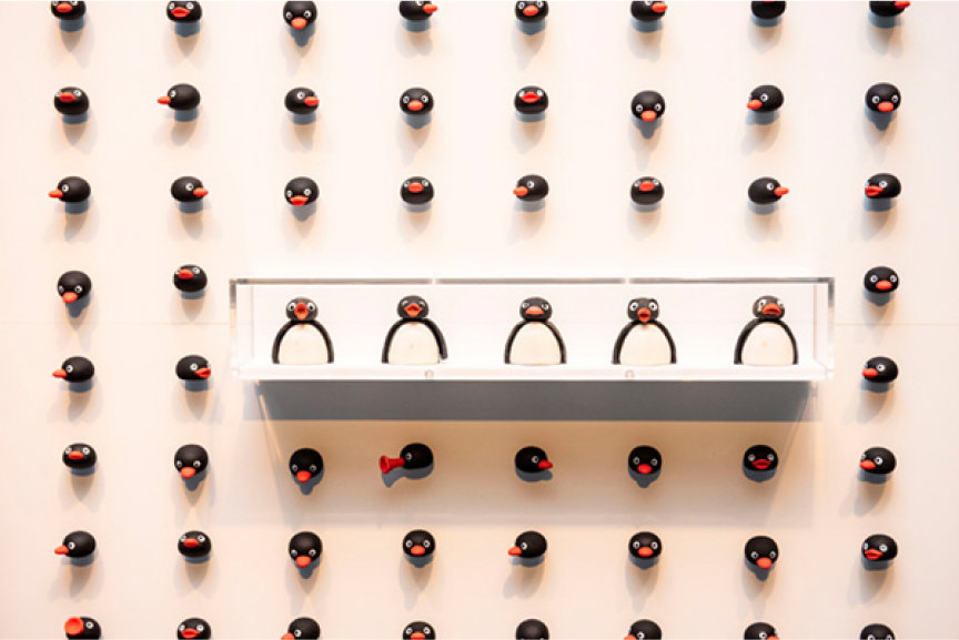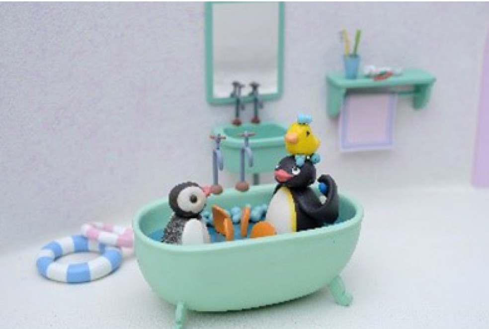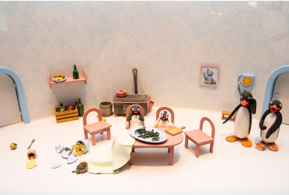 ピングーが伸び縮みしたり、羽ばたいたり躍動感あふれるシーンを表現するために作られたクレイ人形を時系列に並べて展示。物語を彩る精巧な小物の数々も見ているだけで楽しく、ピングーの世界に引き込まれます。ピングー・スタジオ内部の貴重なプライベート映像も上映。