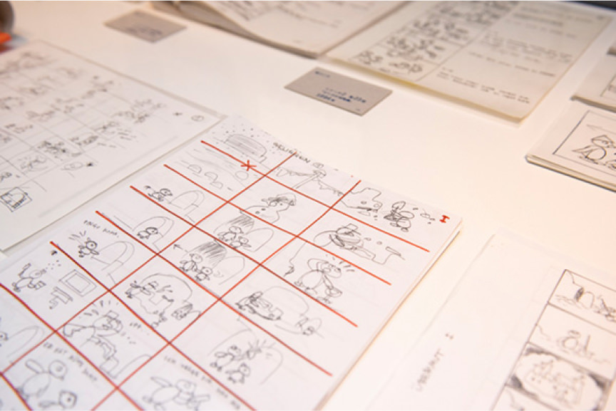原作者のオットマー・グットマン氏の字コンテや直筆メモ入りポラロイドなどを展示。「ピングーの遊園地」のエピソード秘話を紹介。